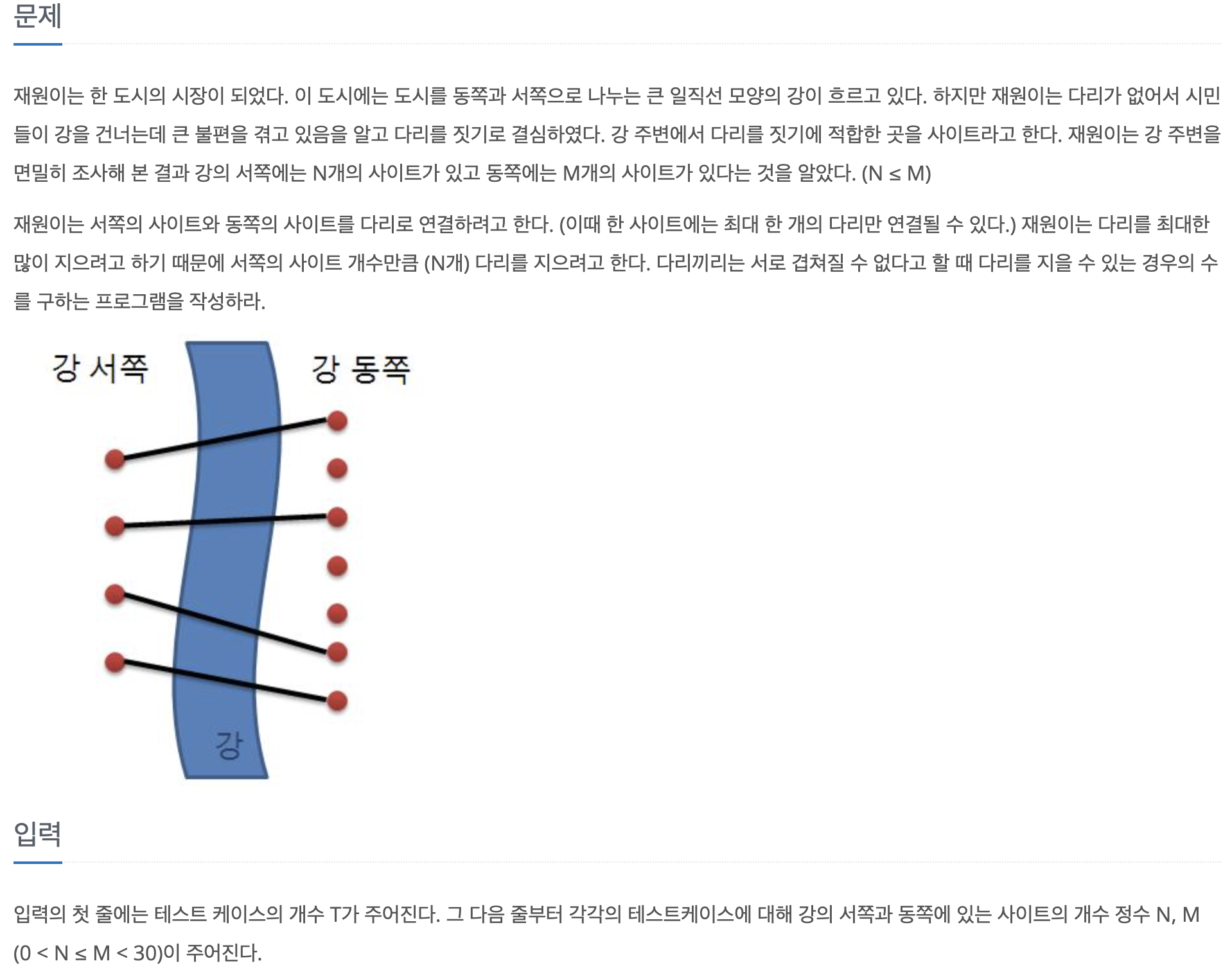 다리는 겹쳐서 놓을 수 없고, n <= m이므로